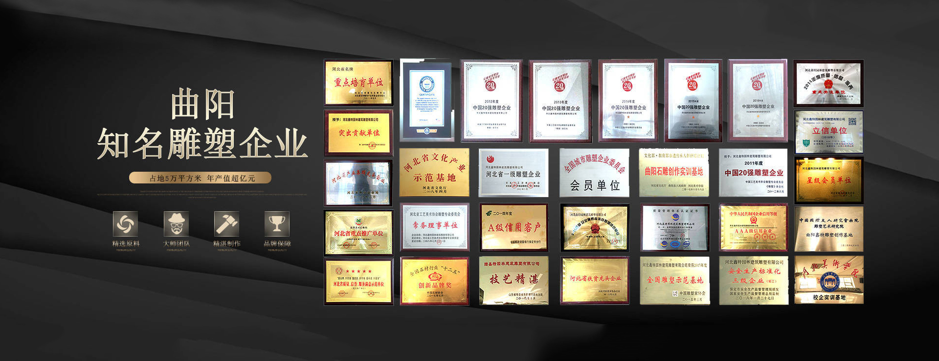 同時(shí),公司也是行業(yè)內(nèi)的佼佼者,連續(xù)七年榮獲“中國(guó)20強(qiáng)雕塑企業(yè)”,并被命名為“全國(guó)雕塑示范基地”,在國(guó)內(nèi)外雕塑藝術(shù)領(lǐng)域享有較高聲譽(yù)。2017年,曲陽(yáng)縣河北鑫特園林雕塑公司還被文化部、教育部、人社部命名為“中國(guó)非遺石雕傳承人群研培實(shí)訓(xùn)基地”。